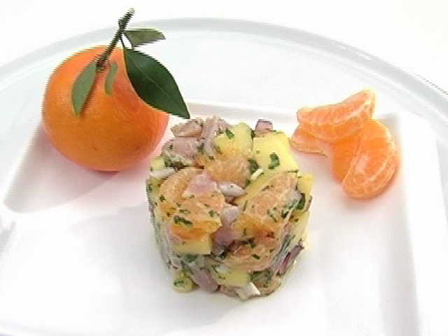 Свежий салат из тунца с апельсиновым соусом.Состав:мандарин — 1 штука;манго — 1 штука;лук — 1/2;сок половины лимона;тунец — 3 кусочка;кориандр, оливковое масло, соль — по вкусу.