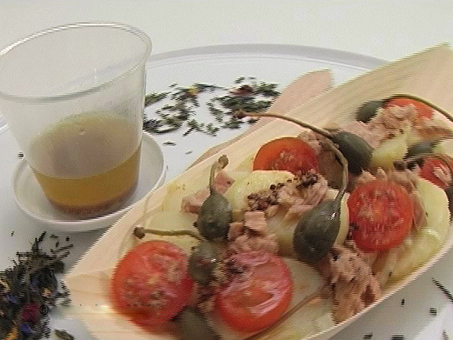 Вкусное блюдо для пикника.Состав:картофель — 4 штуки;помидорки черри — 4 штуки;лук — 1/2 штуки;каперсы — 12 штук;консервированный тунец — 1 банка;соль, перец, оливковое масло, зернистая горчица, вишневый уксус — по вкусу.